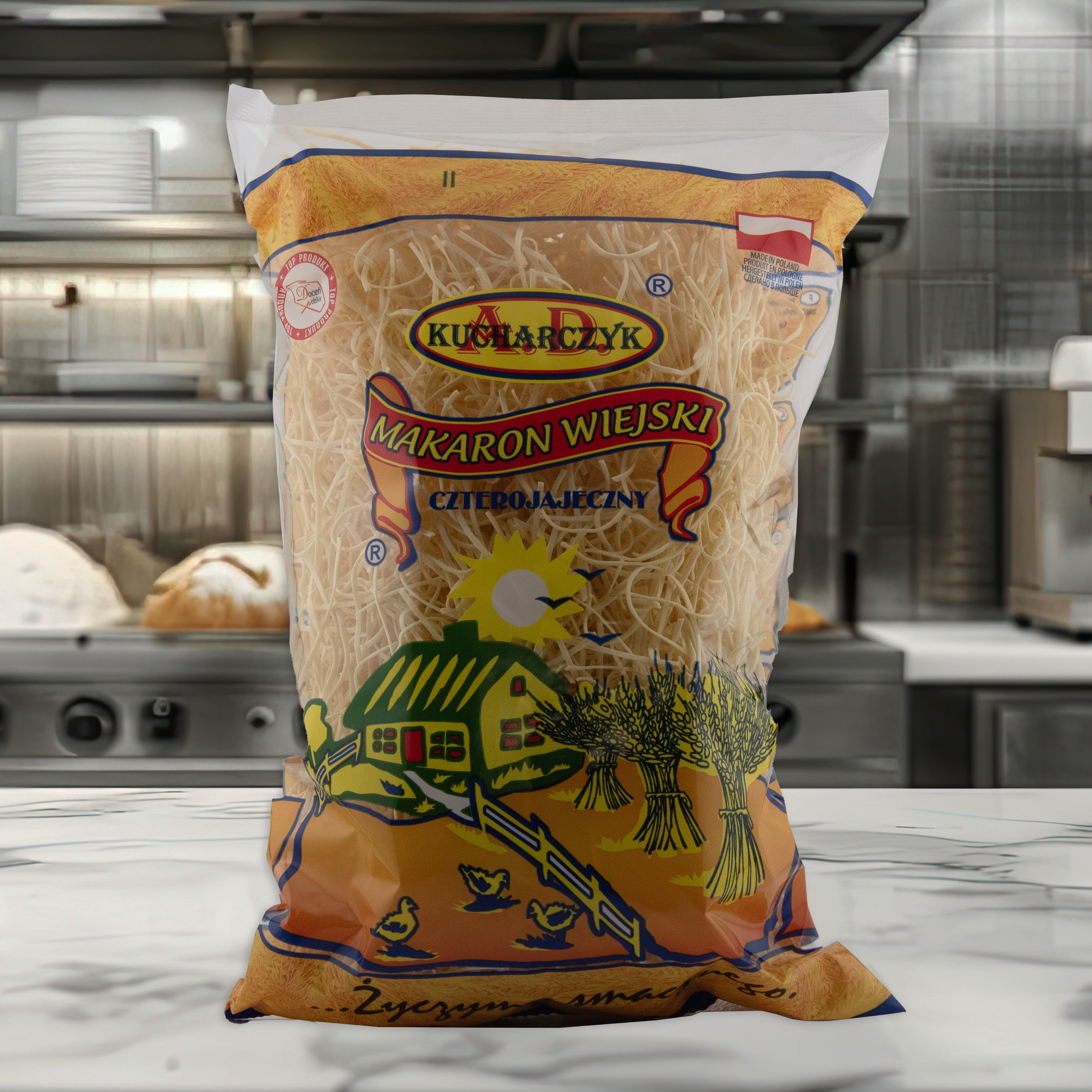 Makaron Wiejski is an authentic, four-egg village-style pasta from Kucharczyk, crafted using time-honored recipes passed down through generations. This pasta offers a delightfully firm texture that complements a variety of dishes—perfect for hearty soups, creamy casseroles, or traditional Polish meals. Its unique flavor and quality make it an excellent choice for those seeking a taste of genuine heritage. Warta Delicatessen proudly offers this pasta, ensuring you experience the best of Polish culinary traditions with each meal.